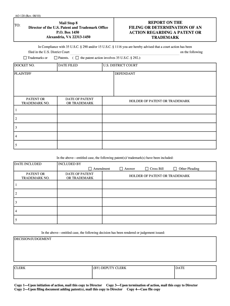 Submit the form: File the completed AO 120 at the appropriate court along with any required fees.